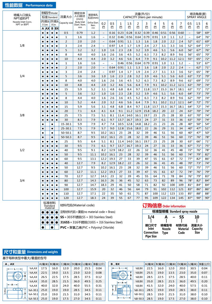 A/B系列廣角中小流量噴霧噴嘴的特點(diǎn)是能產(chǎn)生空心錐形噴霧形狀,噴射區(qū)域呈環(huán)形,噴霧角度為88°-144°。該類噴嘴能產(chǎn)生分布均勻,液滴大小為小到中等的噴霧。此外還具有大而通暢的流通道,能減少或消除阻塞現(xiàn)象。